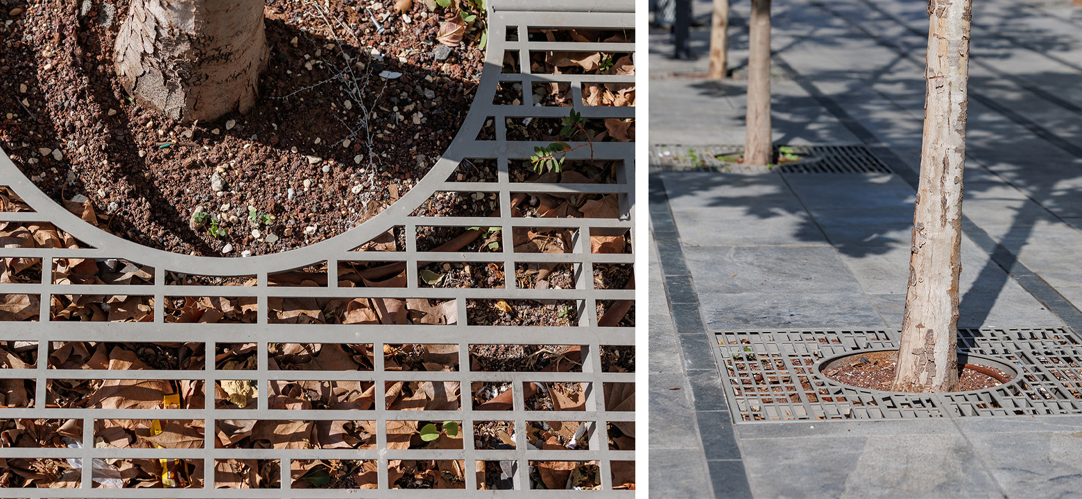 شبكة زخرفية مكوّنة من صفيحة مجلفنة مقطوعة بالليزر، مطلية بطلاء إلكتروستاتي، ويمكن اختيار لون المعدن من كتالوج RAL.