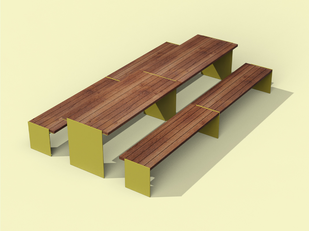 نظام جلوس مكوّن من طاولة ومقاعد مصنوعة من صفائح فولاذية مجلفنة ومطلية بطلاء إلكتروستاتيكي، مدموجة مع خشب طبيعي صلب.