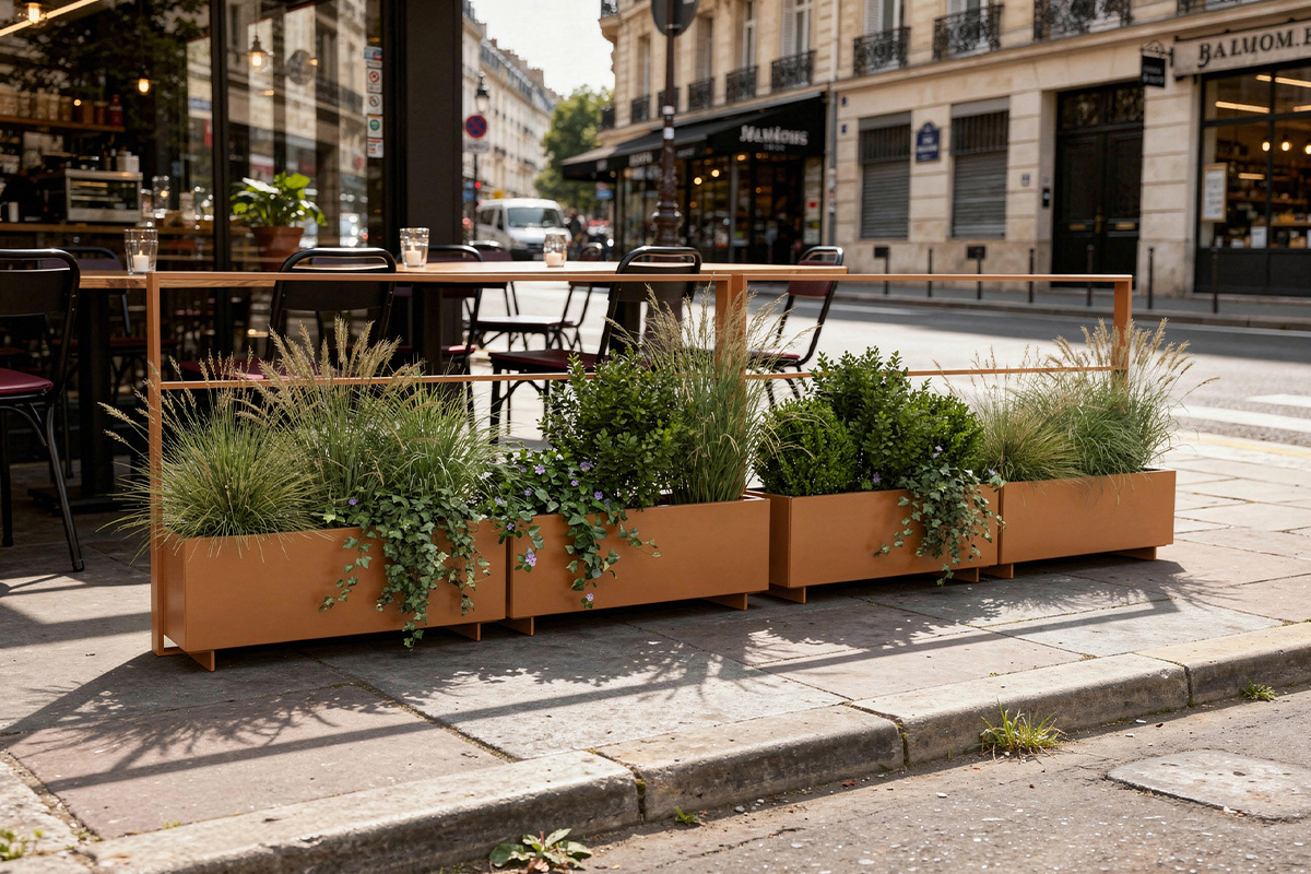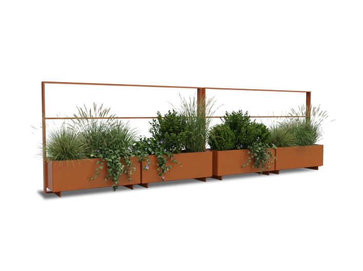גדר דקורטיבית המורכבת מצינורות של פח מגולוון, צבוע בצביעה אלקטרוסטטית. ניתן להזמין עם אדניות חורש. צבע המתכת ניתן לבחירה מתוך קטלוג RAL.