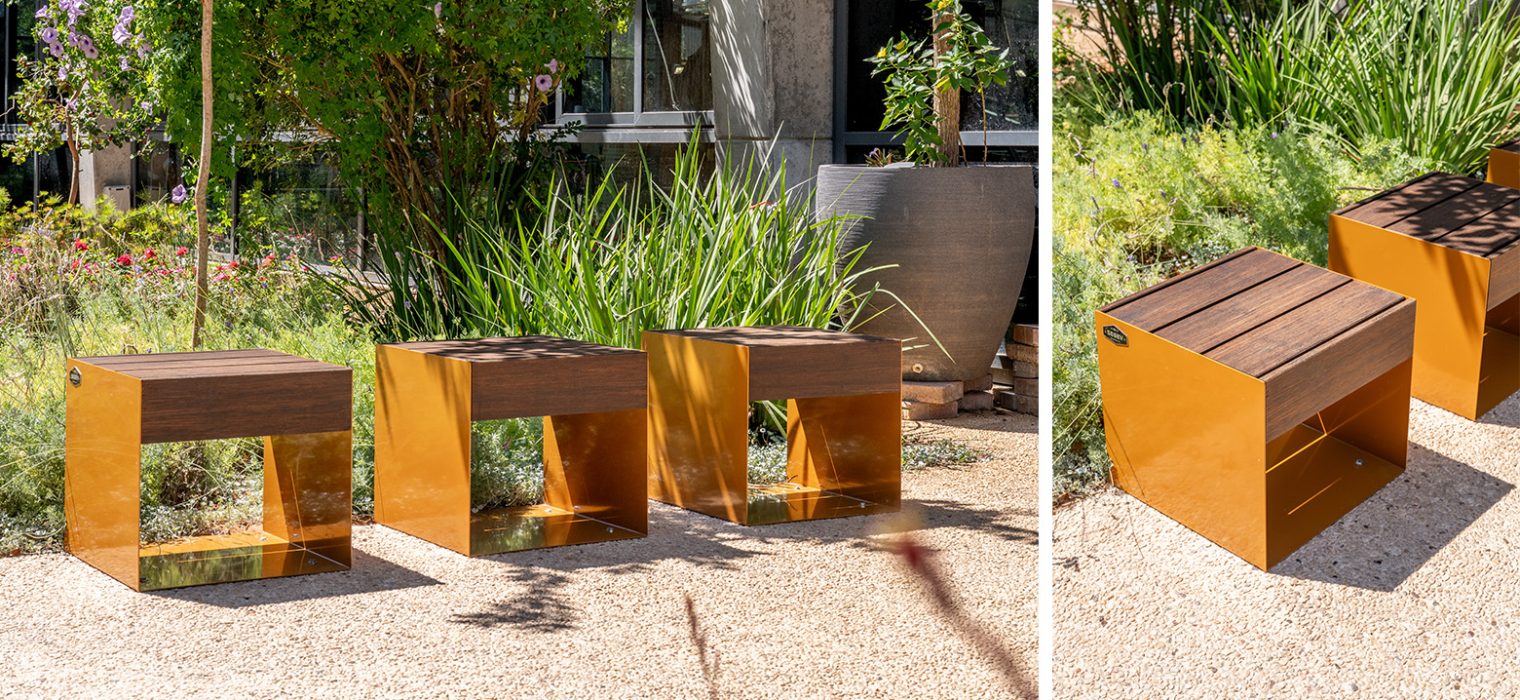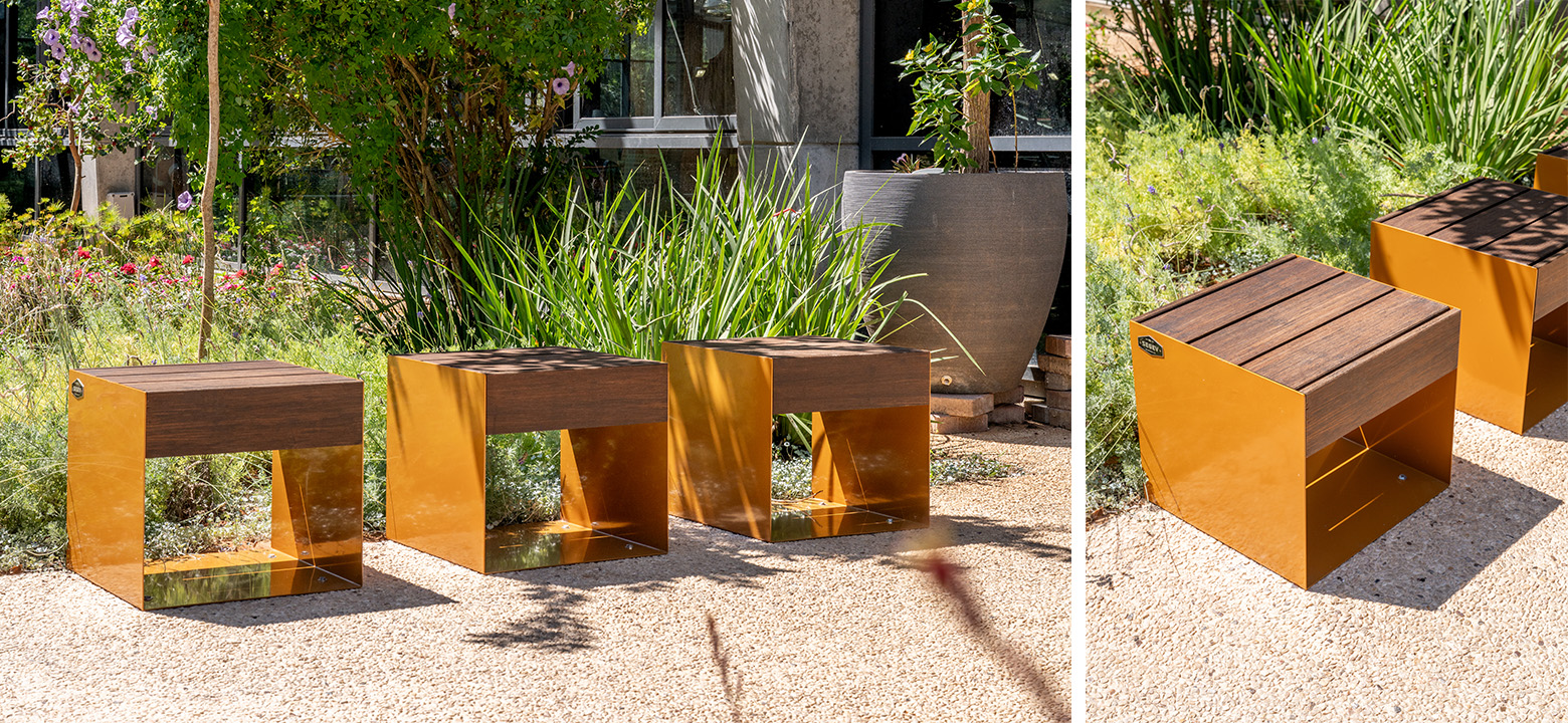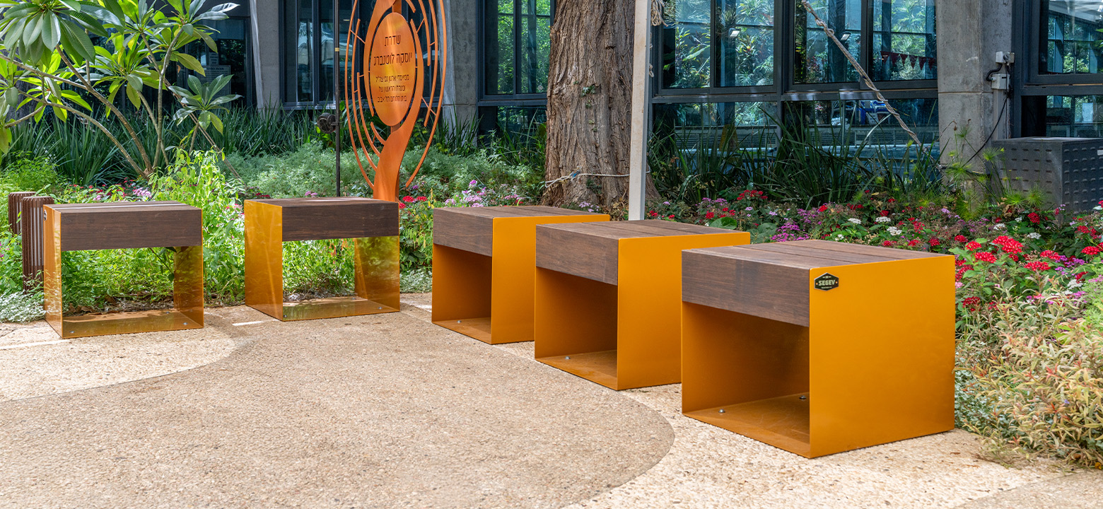 מושב המורכב מפח מגולוון בצביעה אלקטרוסטטית בשילוב לוחות עץ מלא, המוצר קיים בשני דגמים אליהם ניתן להגיע ב’בחר דגם’. צבע המתכת ניתן לבחירה מתוך קטלוג RAL.