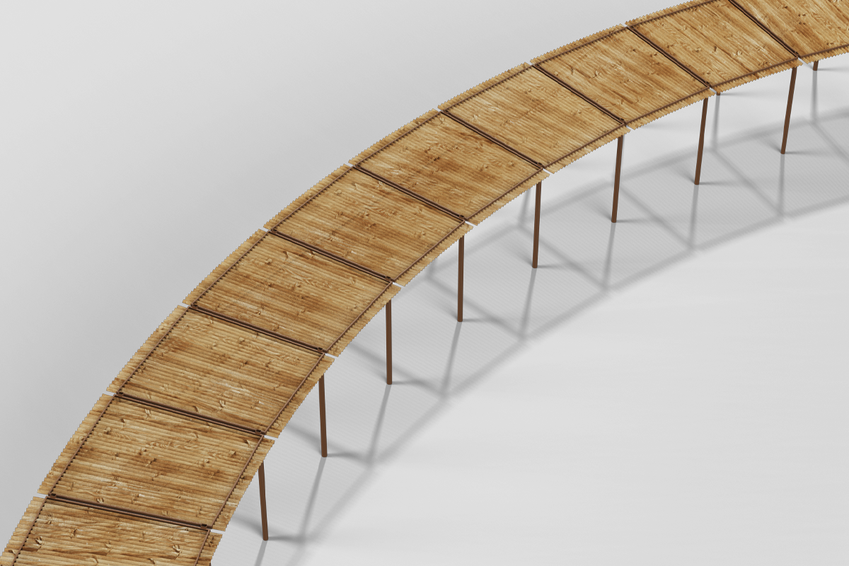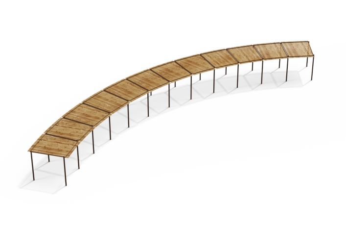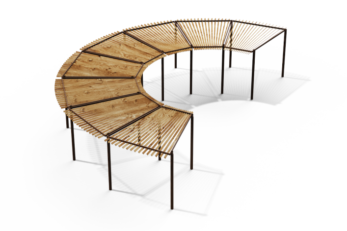 פרגולה רדיאלית המורכבת מקונסטרוקציית פח מגולוון צבוע בצביעה אלקטרוסטטית בשילוב רפפות עץ מלא, צבע המתכת ניתן לבחירה מתוך קטלוג RAL.